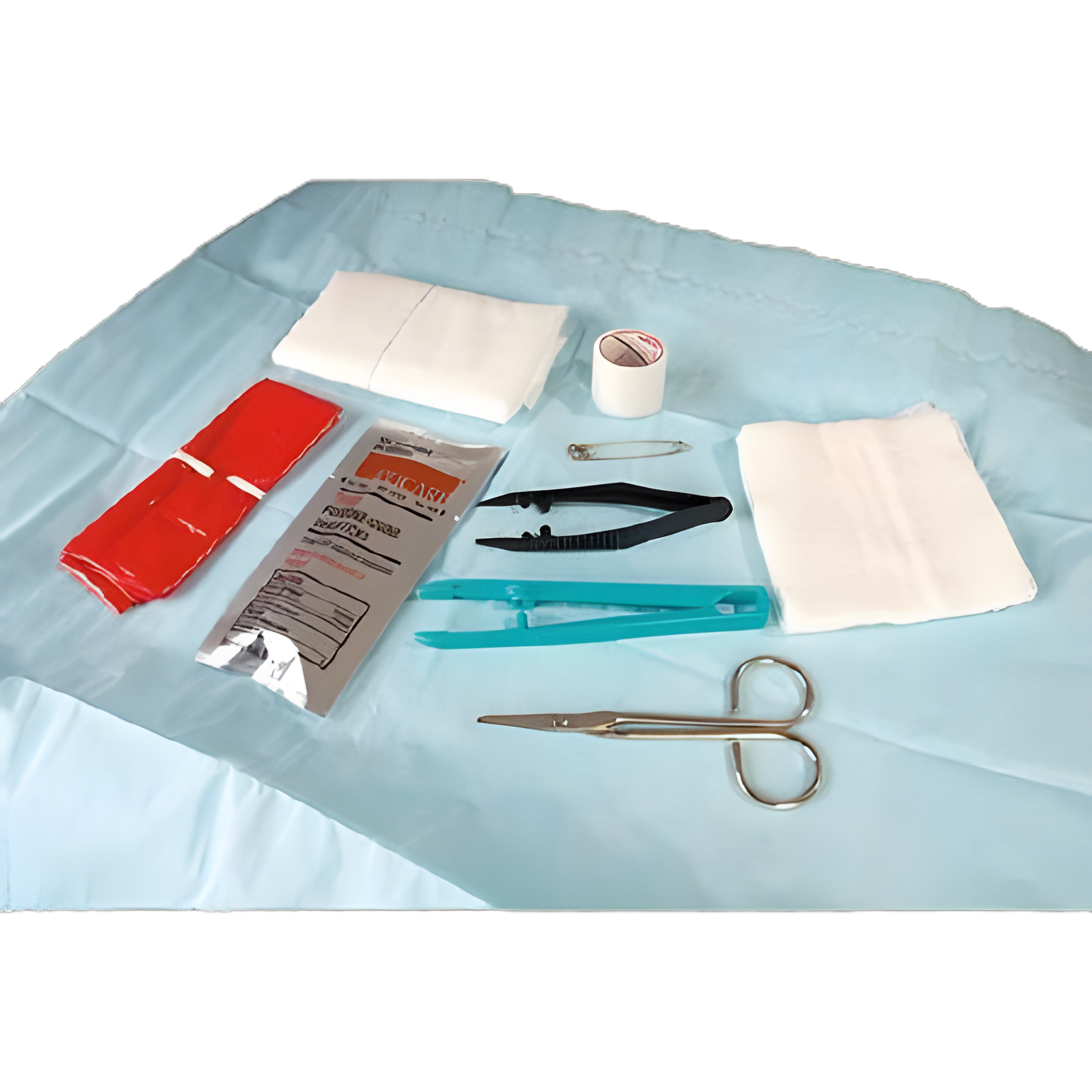 Polylined Sterile Towel, Abdominal Pad, Safety Pin, Iodophor PVP Swabstick(triples), 4 Gauze Sponges 4X4 Inch, Sharp/Blunt Scissors, Polybag with Twist Tie, Roll Medical Tape, Transfer Forceps, Posi-Grip Plastic Forceps, Tray