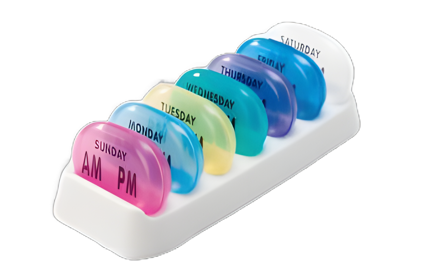 - Seven daily pill boxes, each has two compartments with snap close lids