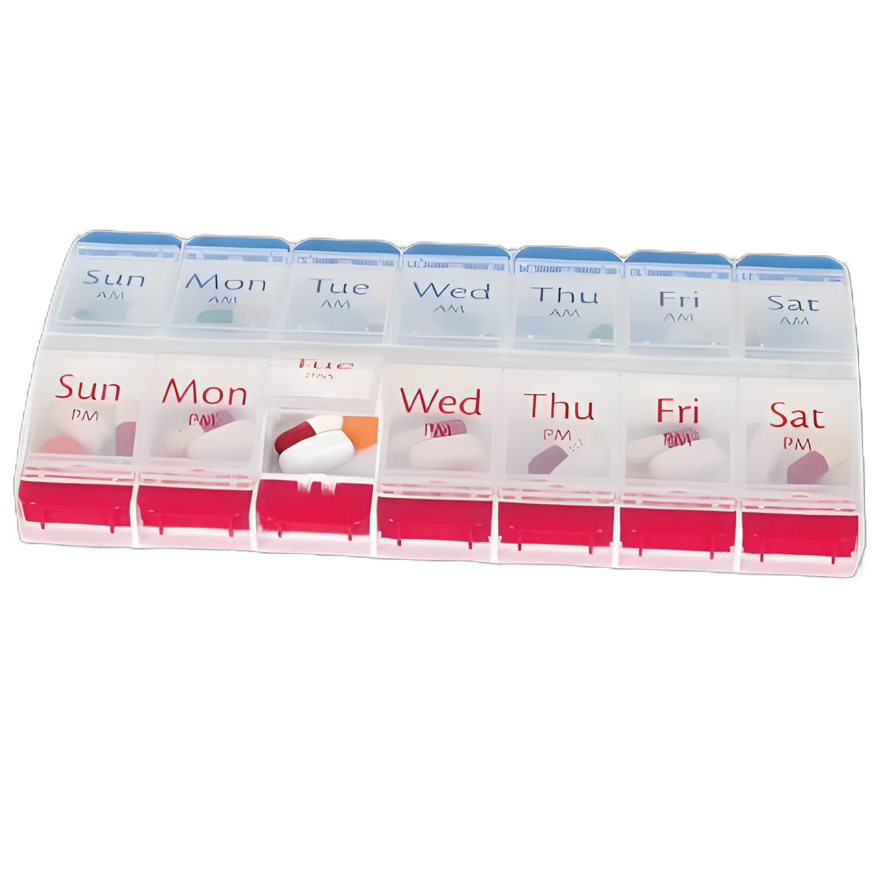 - One-touch push button releases the lid for easy access; each day has compartments for morning and evening medications